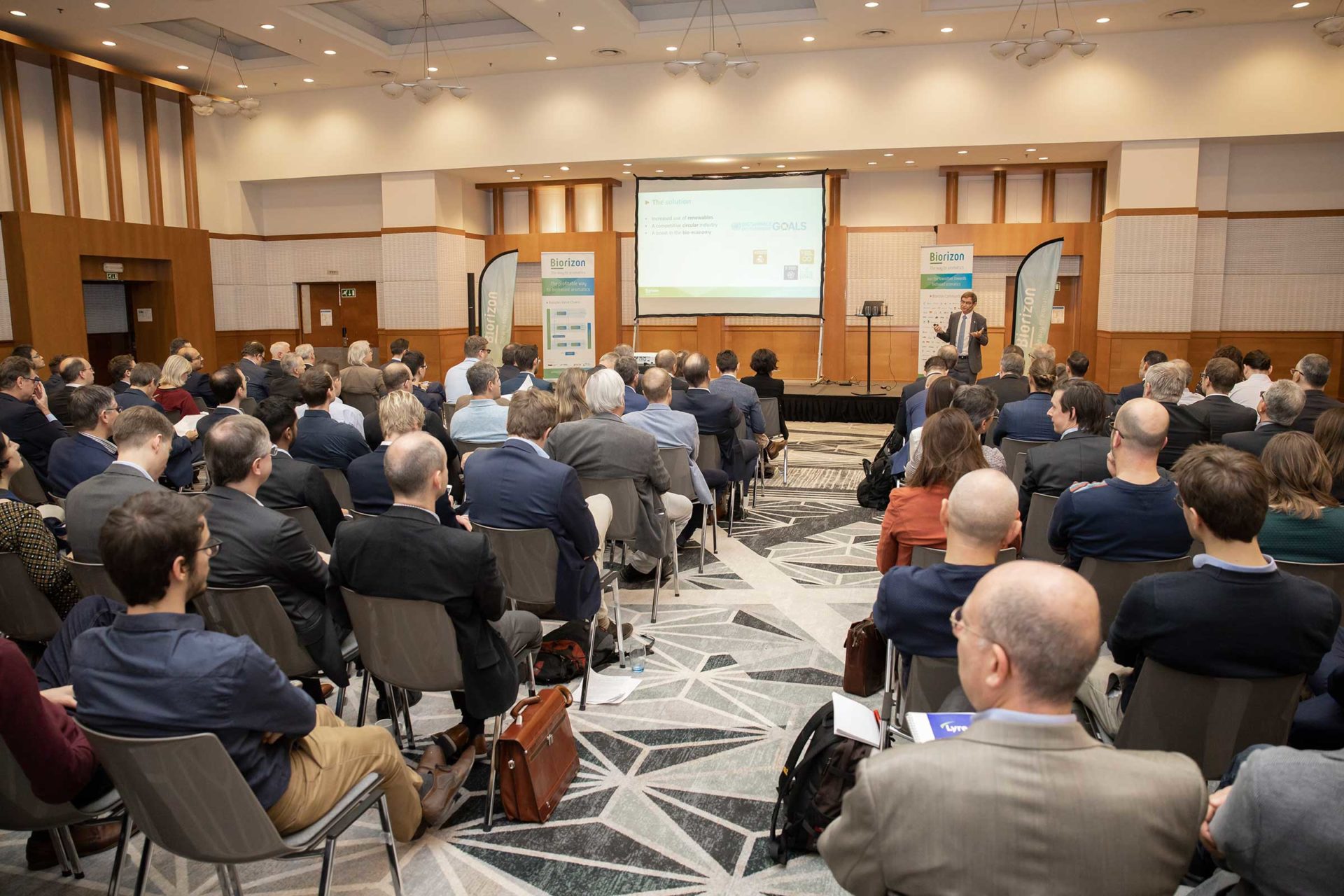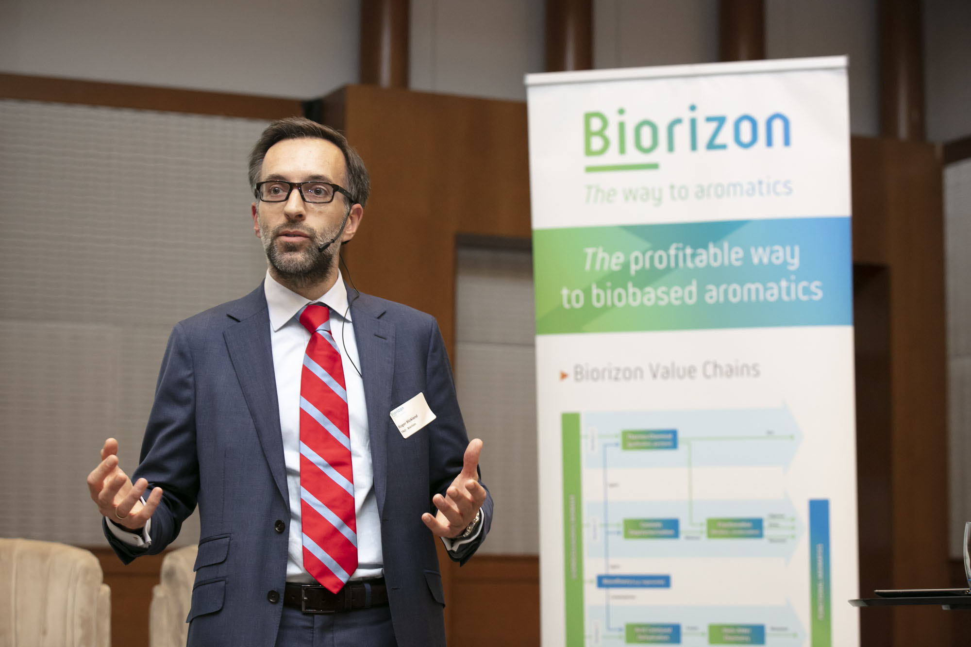 Biorizon has also made major leaps forward in the production of bio-aromatics from sugars. Roger Blokland of Biorizon’s co-initiator TNO spoke about the results of the pilot plant that is now in use at the Green Chemistry Campus in Bergen op Zoom. Research there did not first and foremost focus on bulk products, but on specialties with a higher added value. Such as hemimellitic acid (for use in PU, greasing agents and plasticisers) and various variants of anhydrides of phthalic acid (for UV-resistant coatings, plasticisers, epoxy curing agents and other innovative applications).