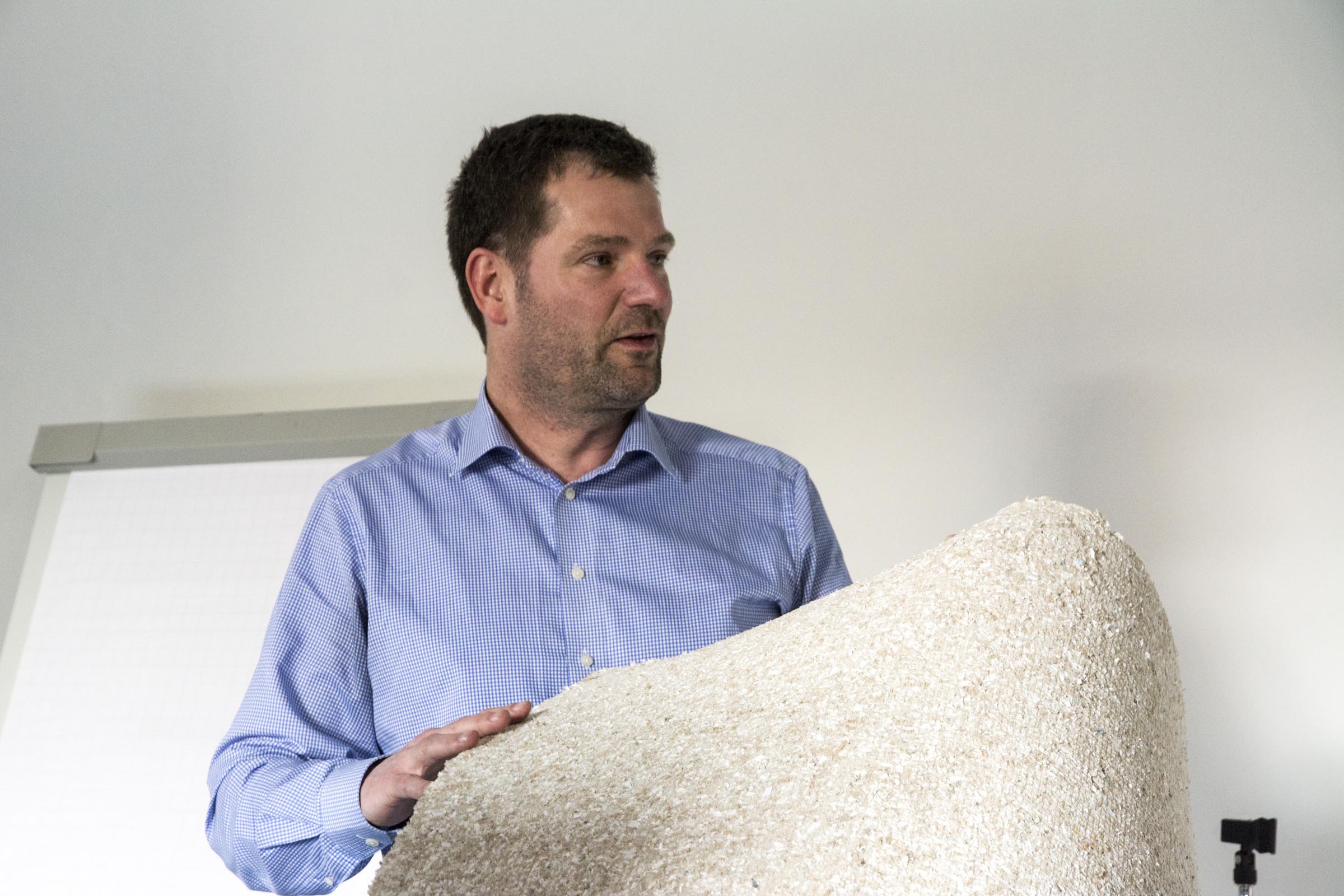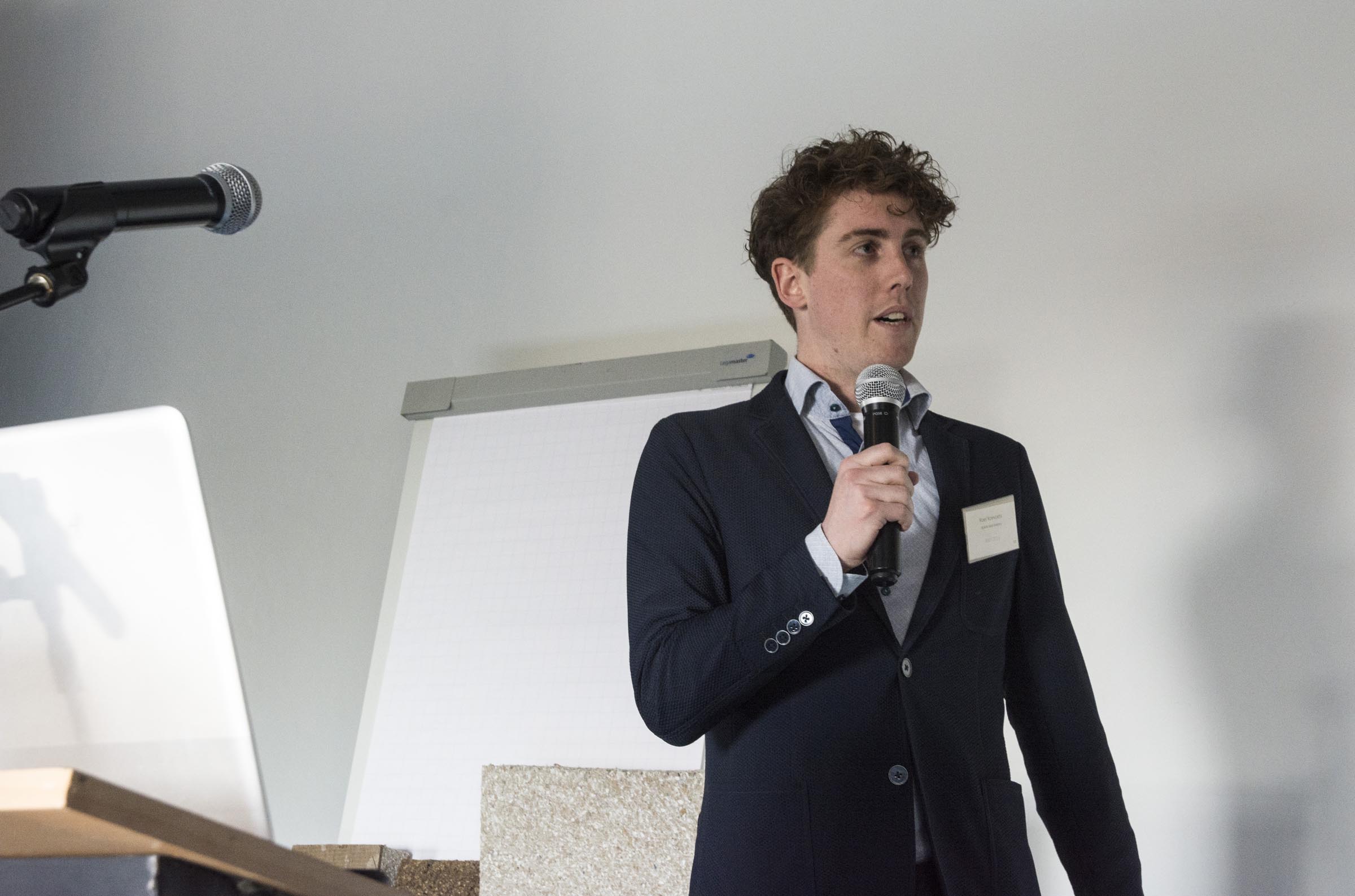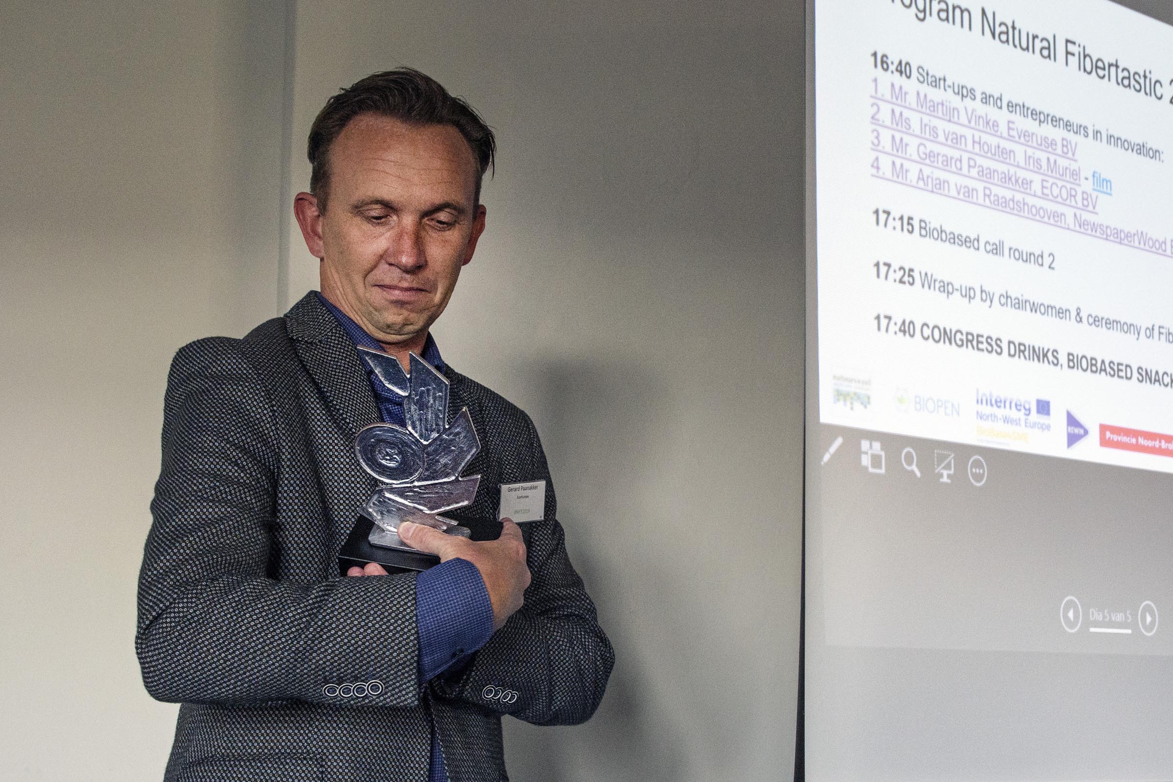 The program further included presentations by Wridzer Bakker (Plantics, winner of the Natural Fibertastic Award 2018), Jan Schrama (director of Poly Products, about large-scale fiber-reinforced 3D printing) and a number of start-ups who are competing for this year’s NFT Award: Martijn Vinke of EverUse (circular insulation plates of paper), Iris van Houten of Iris Muriel (a folding wooden ‘power nap’ sofa), Gerard Paanakker from ECOR (Niaga Ecor Panels, insulation panels from pure cellulose fiber, in collaboration with DSM Niaga) and Arjan of NewspaperWood (veneer from compressed old newspapers). The jury chose ECOR as the winner of the Natural Fibertastic Award 2019.