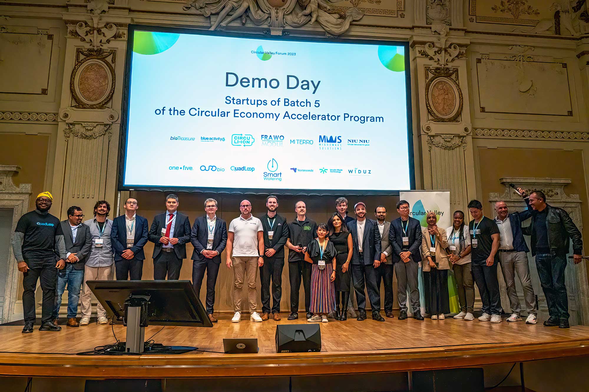 The Forum concluded with the ‘Demoday‘: pitches from 14 young startups that were mentored by the Circular Valley Community from September this year. They focus on diverse facets of circularity: alternative raw materials, building materials, packaging, water and recycling. Remarkably, these startups came from all over the world: Germany (4x), the US (2x), Luxembourg, Switzerland, Serbia, Ecuador, Nigeria, Singapore, Yemen and Mexico.