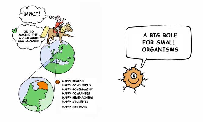 Here, it makes quite a difference whether working at lab scale or in larger volumes. “Scaling-up is a different story in microbiology. It works very differently in large volumes. You will have to face questions like: when do I have collected enough biomass to make the product? How do I get the nutrient into the reactor? And how can I separate, purify and concentrate the substances in the down stream processing stage after fermentation? Again, you will need other disciplines for that. It demands a lot, because you have to understand each other’s language. It doesn’t come naturally. After all, when a microbiologist and a process technologist discuss biomass, they are both talking about something completely different.”