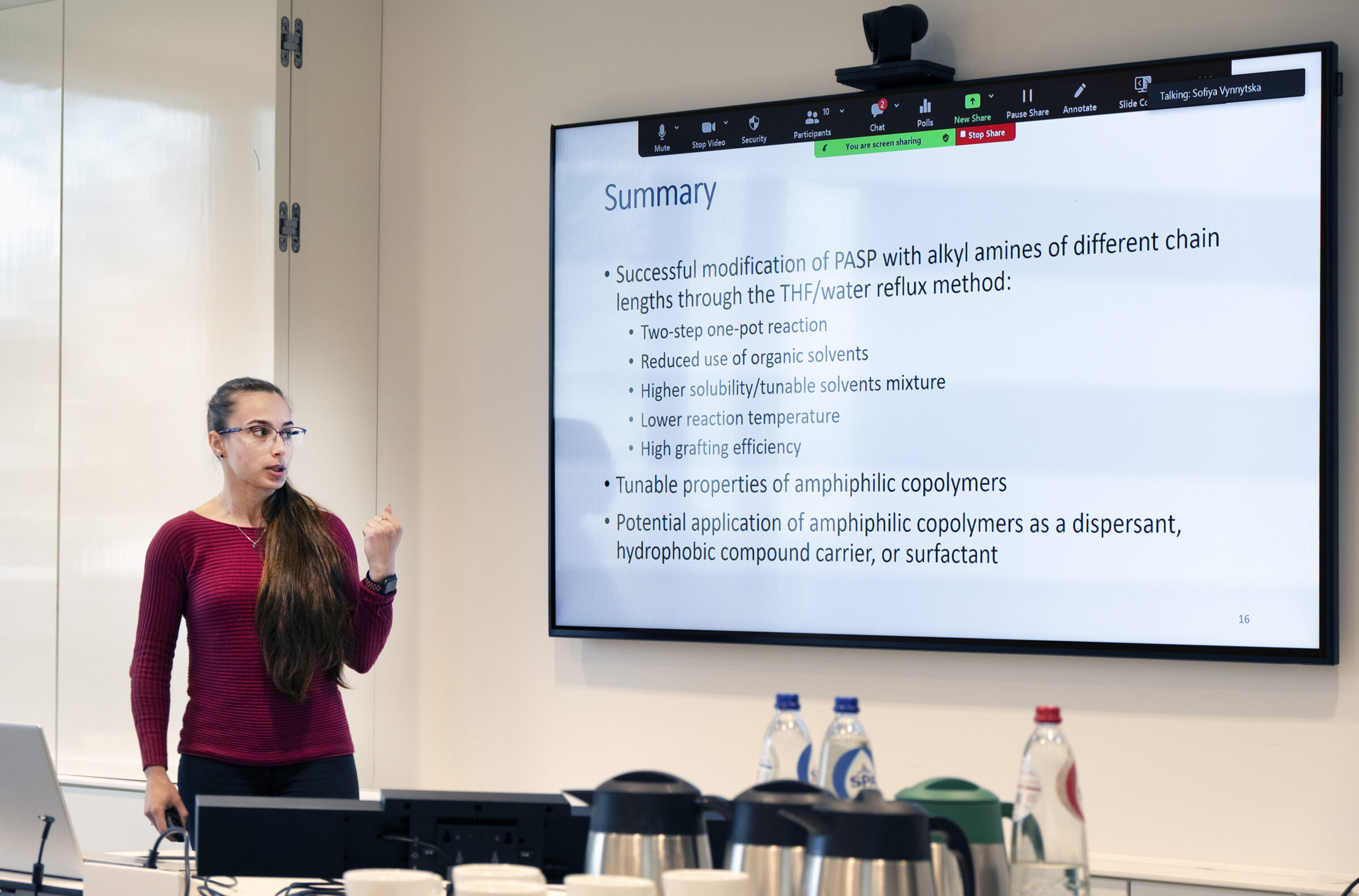 Sofiya Vynnytska, PhD student at Maastricht University in Associate Professor Katrien Bernaerts’ group, is one of the scientists who played a role in researching these modifications. She worked on an efficient mild method for the synthesis of polyASP-based biodegradable amphiphilic copolymers. While standard high-boiling, toxic solvents are used for this type of synthesis, she developed a method using low and less toxic solvents at a low temperature (56 degrees Celsius). Amphiphilic copolymers contain both hydrophobic and hydrophilic components. The ratio between the two types determines the final properties of the polymer. Possible applications can be found in dispersants and surfactants.