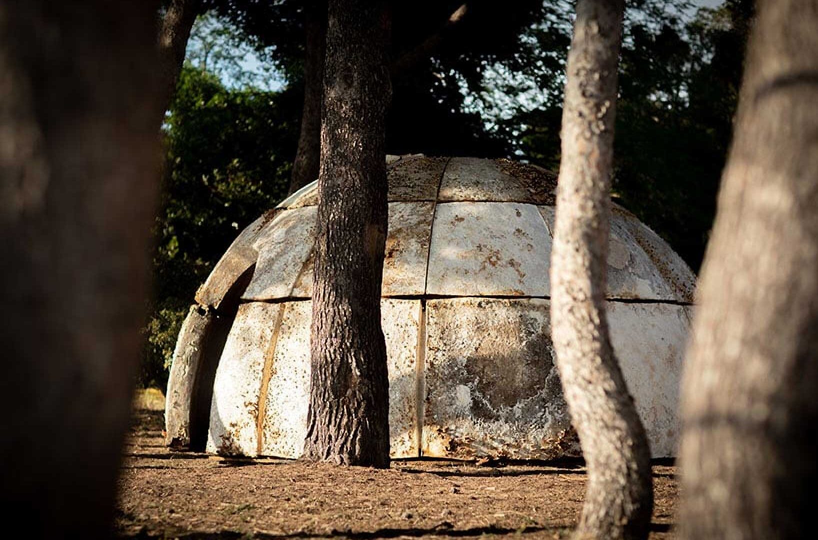 The dome is completely biobased and biodegradable, so it is meant to eventually return to the earth, serving as a fertiliser for the soil. Its disappearance is also an artistic gesture: when the mycelium breaks down, a hidden wooden structure carved by hand is gradually revealed.