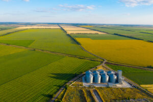Aerial,View,New,Grain,Elevator,And,A,Field,Of,Sunflowers