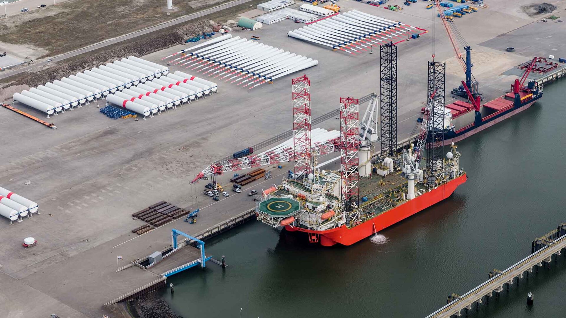 Image: Wind turbine parts and installation vessel at Eemshaven Northern Netherlands, T.W. van Urk/Shutterstock